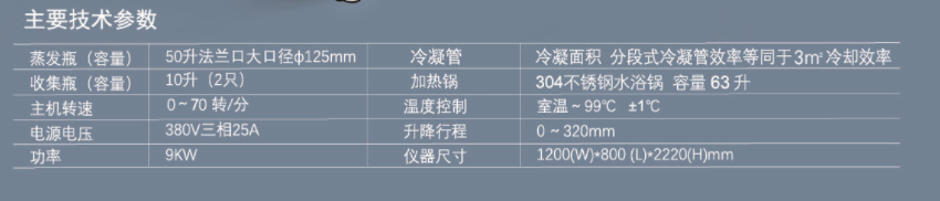 | 關(guān)鍵字 | 容量范圍:50L 規(guī)格: 蒸發(fā)瓶:50L 瓶口:125mm 收集瓶:20L(10L*2) 變頻調(diào)速:0-70轉(zhuǎn) 溫控:室溫~99℃±1℃ 升降:自動(dòng)懸臂升降0-320 mm 電源:380V 三相25A |