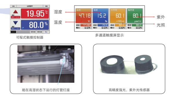 ● 光照系統(tǒng)可選擇擱板式光照系統(tǒng)或外門光照系統(tǒng),含可見光燈管和紫外光燈管,可單獨控制可見光燈管和紫外燈管,也可選擇單層或雙層可見光燈管或紫外光燈管;可調節(jié)載物樣品擱板在工作室內的高度。(雙層下光照系統(tǒng)選配)