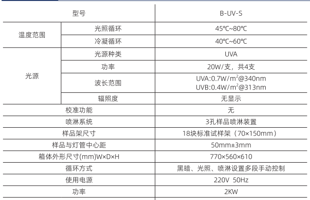 B-UV-S適用于通過光和水曝露加速老化試驗(yàn),對(duì)油漆、涂料、塑料等非金屬材料的相對(duì)耐久性進(jìn)行評(píng)估。尤其適合觀察特別耐用材料的物理性能破壞,如光澤降低、褪色、霧影、強(qiáng)度降低、粉化、開裂、起泡和脆化等。還適用于食品、藥品、化妝品行業(yè)。