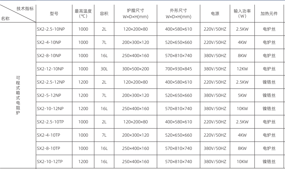 備注 | “N”表示:耐火磚爐膛 “T”表示:陶瓷纖維爐膛 “P”表示:可程式電阻爐 控溫精度:±1℃ 溫度均勻度:5℃(垂直方向) | |||||||