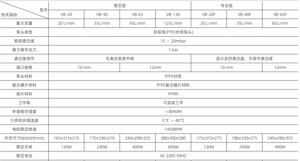 VB 系列耐腐蝕真空隔膜泵是一款介質(zhì)為氣體的雙級(jí)泵,所有與氣體接觸部分,均為聚四氟乙烯(PTFE) 材料,耐腐蝕程度高,適用范圍廣,可完全替代水循環(huán)泵,適合于化學(xué)、制藥、石化等行業(yè)對(duì)腐蝕性氣體的處理,如抽濾,減壓蒸餾,旋轉(zhuǎn)蒸發(fā),真空濃縮,離心濃縮,固相萃取等。