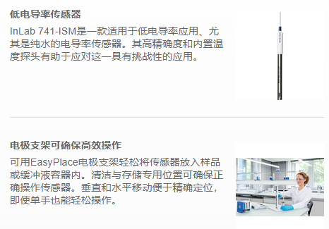SD30電導率儀,配備InLab 741-ISM電導率/溫度傳感器,適用于低電導率測量。該套件包括高效電極支架和電導率標準液,用于傳感器驗證。