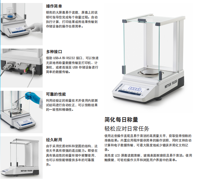高效操作: LCD 混合觸摸屏; 內(nèi)置 9 種應(yīng)用程序; 統(tǒng)計(jì)數(shù)據(jù)分析; 用于在天平下方稱量的掛鉤; 即插即用