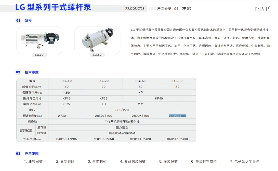 LG 干式螺桿真空泵是我公司在吸收國(guó)外眾多真空泵優(yōu)越技術(shù)的基礎(chǔ)上,采用新一代復(fù)合變螺距螺桿技術(shù),自主創(chuàng)新而開發(fā)的小型風(fēng)冷干式螺桿真空泵,具備高效、節(jié)能、環(huán)保、輕巧、使用方便、性能可靠 等特點(diǎn)。主要應(yīng)用于制藥工藝、凍干、化學(xué)工藝、溶媒回收、有機(jī)溶劑回收、醫(yī)療儀器、生物制品、油氣回收、薄膜制備、生化檢測(cè)分析、半導(dǎo)體、微電子、太陽(yáng)能、材料處理等相關(guān)設(shè)備及工藝流程。