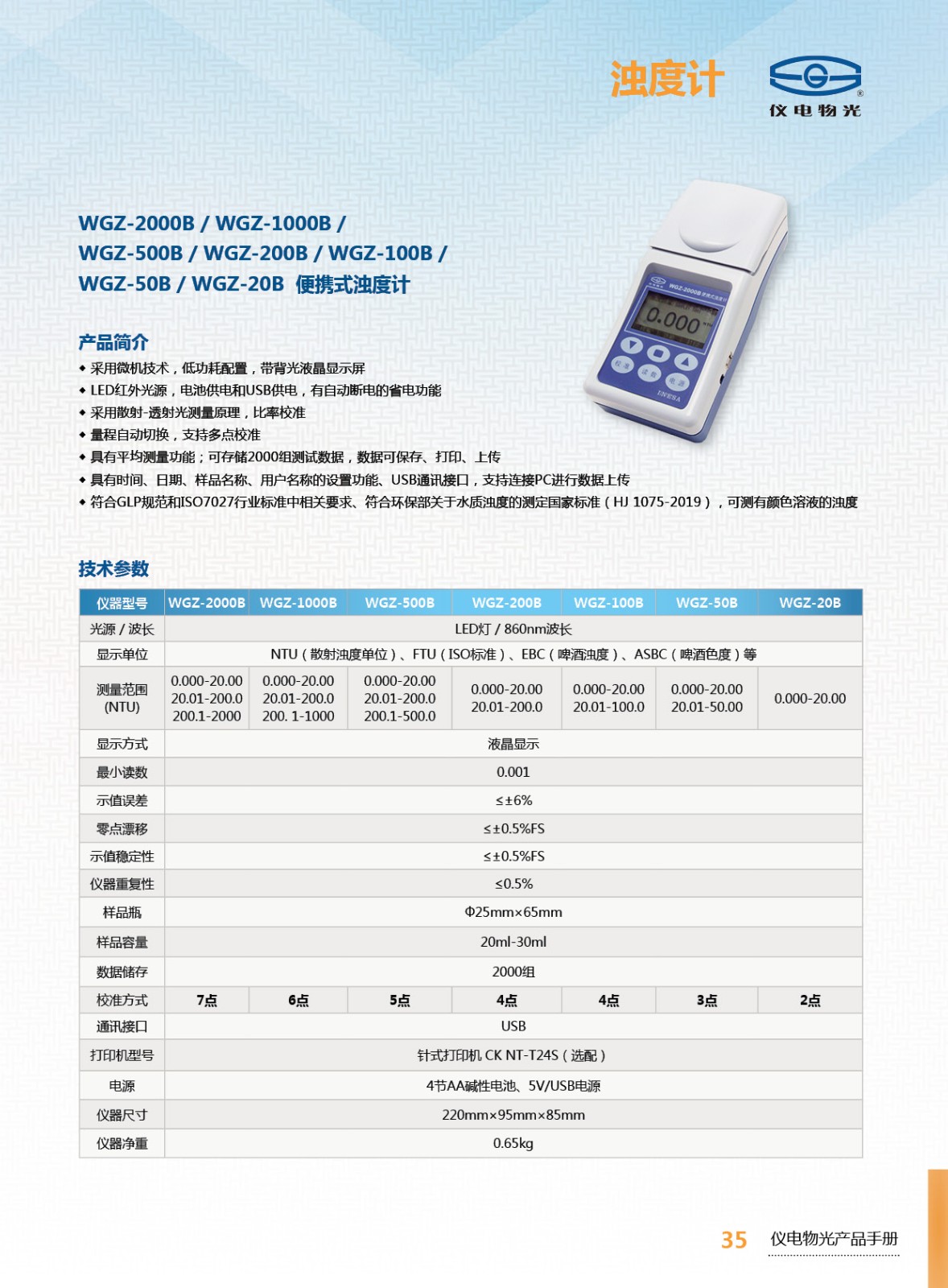 - 關(guān) 鍵 字: LED光源 860nm波長 液晶顯示 測量范圍:0.000NTU-20.00NTU;20.01NTU-200.0NTU;200.1-2000 NTU 最小讀數(shù):0.001 示值誤差:≤±6% 零點(diǎn)漂移:≤±0.5%F 示值穩(wěn)定性:≤±0.5%FS 儀器重復(fù)性:≤0.5% 2000組數(shù)據(jù)儲存 校準(zhǔn)方式:7點(diǎn)