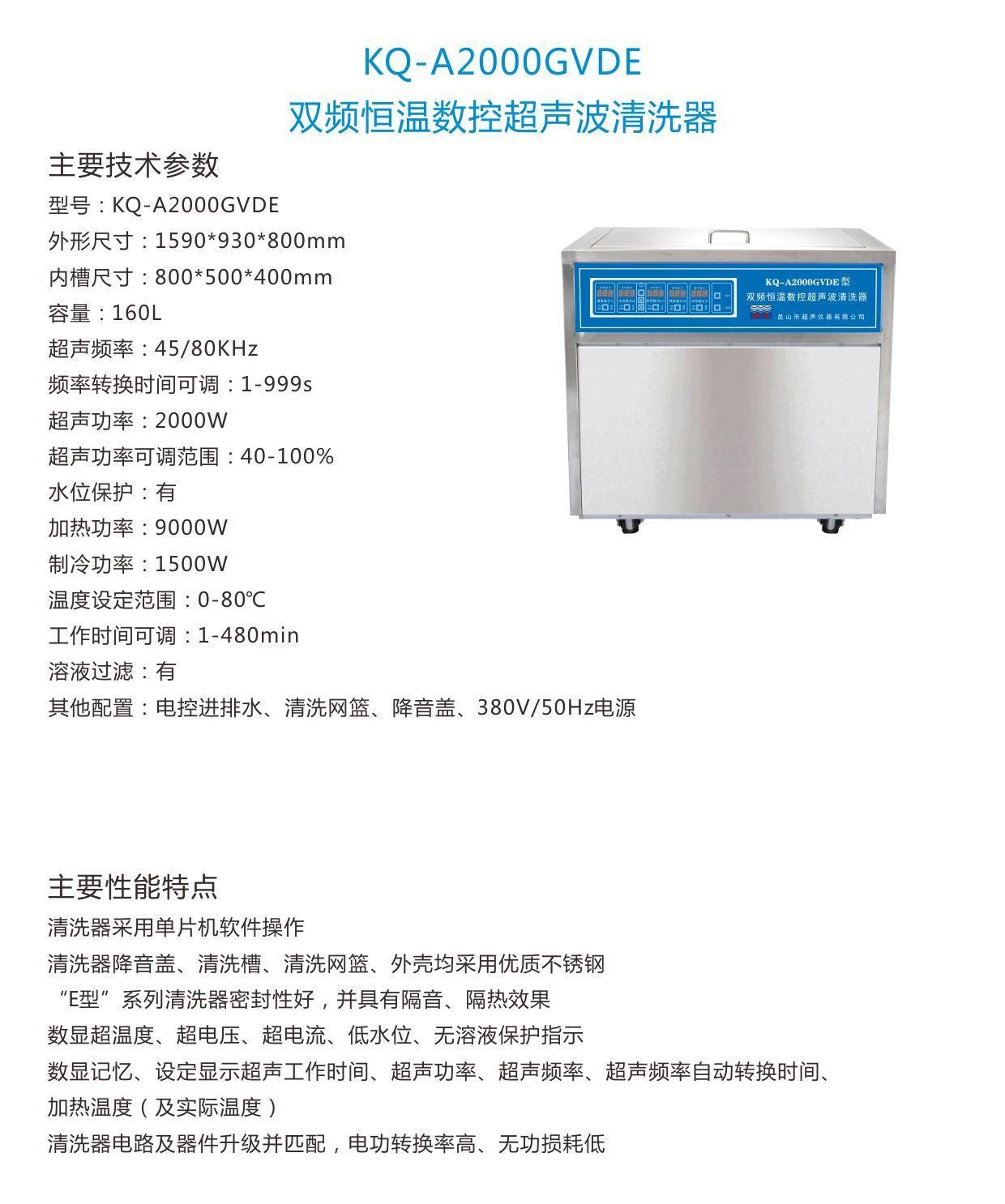 - 關(guān) 鍵 字: 清洗槽內(nèi)尺寸:800*500*400 容量L:160L 超聲功率W:2000 加熱功率W:9000 制冷功率:1500 降音蓋:電控